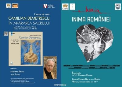 In prima zi, Centrul Cultural „Dacia” din Bistrita a gazduit lansarea albumului-jurnal „Camilian Demetrescu – In apararea sacrului”, semnat de Marilena Rotaru si aparut la Editura Vremea.